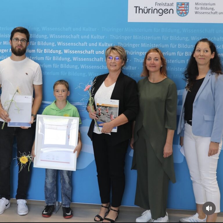 Am Donnerstag, d. 18.09.2025 zeichnete der Landessportbund Thüringen zum 10. Mal die „Bewegungsfördernde Schule 2025“ aus. Wir freuen uns sehr darüber, einer der Preisträger zu sein. Diese Ehrung erfüllt uns mit Stolz und zeigt, dass unser Engagement für einen bewegten und gesunden Schulalltag wahrgenommen und gewürdigt wird. Zugleich motiviert sie uns aber auch, weiterhin gemeinsam für Freude an Bewegung, Gesundheit und Gemeinschaft einzutreten. Ein herzlicher Dank geht an alle, die uns auf diesem Weg begleiten: an unsere Schüler, die immer mit Begeisterung dabei sind, an unser Kollegium, das viele Ideen einbringt, an alle Eltern bzw. Großeltern, für ihre Unterstützung und an unseren Förderverein, der mit großem Einsatz viele Projekte möglich macht. Gemeinsam schaffen wir es, dass Bewegung ein selbstverständlicher und lebendiger Teil unseres Schullebens bleibt.