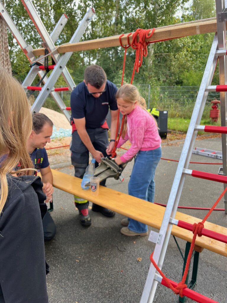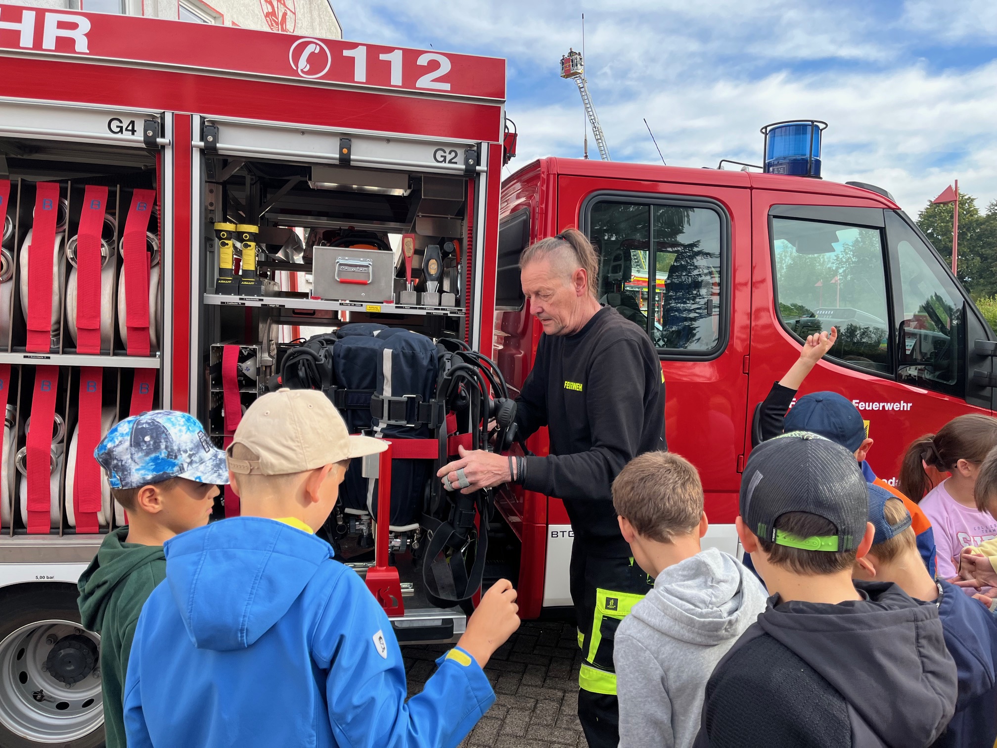 Am Dienstag, d. 09.09.2025 fand für die 4. Klassen ein Feuerwehr-Projekttag statt. Wir haben viele Stationen besucht. Mittags gab es leckere Nudeln mit Tomatensoße. Einige Gruppen haben Feuerwehrautos kennengelernt, gelöscht und fuhren mit einer Drehleiter 30 Meter hoch.