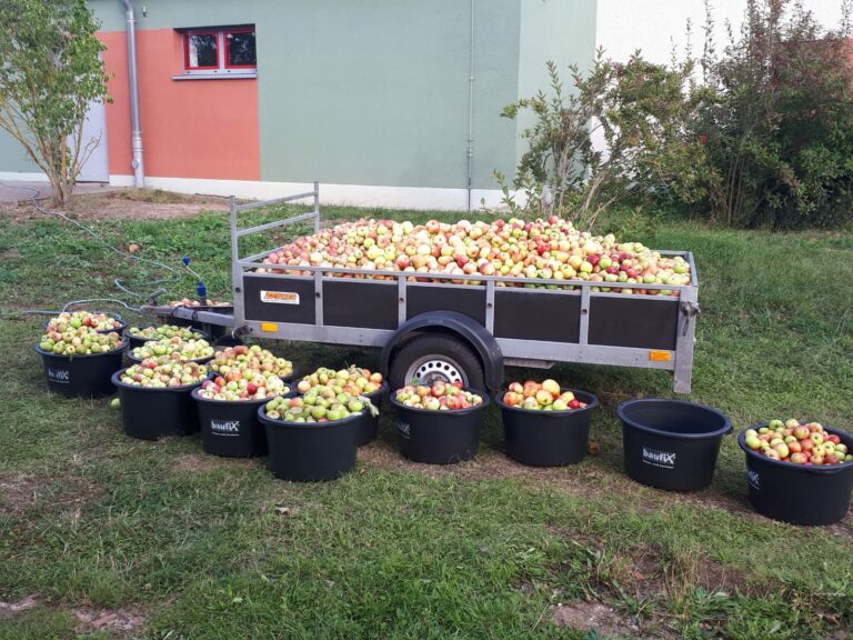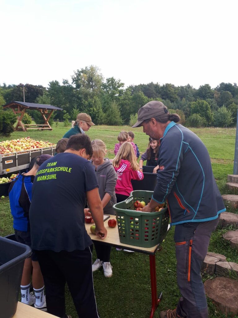 In der Woche vom 01.09.2025 bis 05.09.2025 bereiteten wir den Aktionstag „Apfel“ vor. Alle Schülerinnen und Schüler sammelten fleißig Äpfel. Schnell füllte sich ein großer Hänger. Am Donnerstag, d. 04.09.2025 stellten die 4. Klassen Apfelsaft her. Da hieß es: waschen, sortieren, ausschneiden, noch mal waschen, zerkleinern, pressen, erhitzen und abfüllen. Zum Glück halfen uns Herr Fibig und einige Schüler aus der „Schlossparkschule“ Marksuhl. Dafür sagen wir: DANKE! Am Freitag, d. 05.09.2025 hat unsere Klasse 4b leckeren Apfelkuchen gebacken. Das hat großen Spaß gemacht und wir haben fast alles ganz allein (ohne Frau Herbach) geschafft.